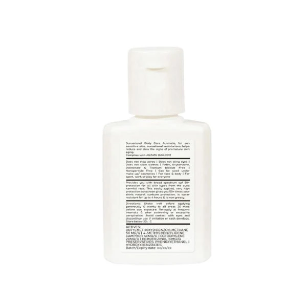 abcdef: object(WP_Post)#40453 (24) { ["ID"]=> int(39398) ["post_author"]=> string(1) "3" ["post_date"]=> string(19) "2023-10-04 13:41:34" ["post_date_gmt"]=> string(19) "2023-10-04 03:41:34" ["post_content"]=> string(1199) "Be protected from the sun with the 60ml Sunscreen Lotion Bottles. This SPF50+ sunscreen is water resistant and has a non-greasy formula. It has a quick drying formula and rubs on easy and clear. It is Titanium dioxide and zinc oxide free and can be used under makeup and cosmetics. TGA certified and made in Australia by Sunsational!