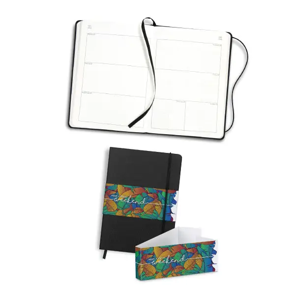 This 2026 diary spans from January to December, showing a week per double spread. It has a leather look PU cover and 80 leaves (160 pages) of ivory coloured 80gsm paper inside. Features include bookmark ribbon, a document pocket, and an elastic closure. There are extra pages like a contact page, project planning and more. Personalisation and/or printed paper belly band available at extra cost.