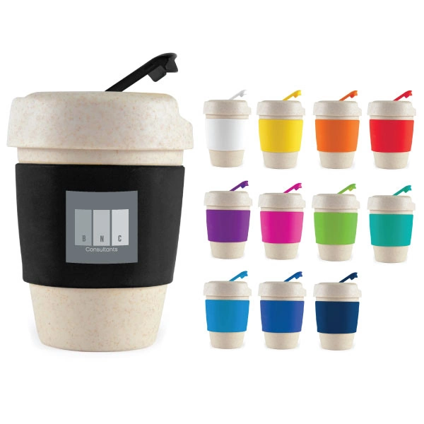 The Bancroft Coffee Cup is a 320ml reusable coffee cup made from a 50/50 blend of wheat fibre and BPA free polypropylene. Includes heat resistant silicone sleeve and screw on lid. Nominate your choice of flip lid and silicone sleeve colours. For logo longevity hand washing is recommended. One Colour Print only.