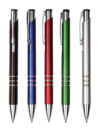 The Bauer Plastic Pen is a very popular option with its metallic coloured barrel, metal clip and shiny chrome trims. Your company logo would give a lasting impression with this classy style which has a medium ballpoint and 1,200m of black ink.