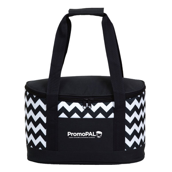Keep your picnic food and drinks cool in style with this chevron cooler. The cooler has a heat sealed leak-proof PEVA lining to keep everything insulated. It also has a front accessory pocket to keep your keys, earbuds or sugar/salt sachets close to hand. Webbing carry handles with a Velcro closure, make carrying the bag easy and comfortable.