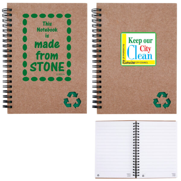 LThe Dakota Stone Notebook is a recycled cardboard cover side spiral bound notebook. 68 lined pages of paper made from stone/rock. Can be marked with metal objects as well as pens. Tough paper works in extreme conditions, water resistant, tear resistant, grease proof and anti bacterial. Recycled symbol die cut on cover. Paper made from recycled construction materials and plasticiser. Paper can be recycled. Due to stone paper pages have a smoother surface than traditional notebook paper. See image for available colour.