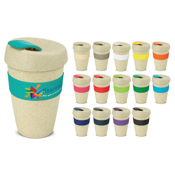 The Express Grande Eco Deluxe - 480ml is a unique reusable coffee cup which is manufactured from a 50/50 blend of natural rice husk fibre and BPA-free polypropylene. It has a heat-resistant silicone band and a secure screw on lid with a splashproof flip closure. The flip closure and silicone band can be mixed and matched in any colour combination from the colour palette at no extra cost. An optional black gift box is available on request. Not dishwasher safe so handwashing is recommended.