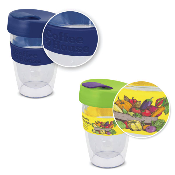 The Hamilton Double Wall Cup - 330ml is a double wall reusable coffee cup which will keep drinks hot for longer. It has a silicone band and a secure screw on lid with a splashproof flip closure. The cup is manufactured from crystal-clear AS plastic and the lid is polypropylene. The lid, flip closure and band can be mixed and matched in any colour combination from the colour palette at no extra cost. Black gift box is available on request. This product is not dishwasher safe and handwashing is recommended.
