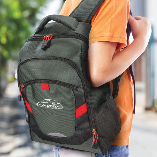 Our Hawkesbury Backpack is an attention-grabbing backpack with outstanding design and superb functionality. It is manufactured from a stunning two-tone combination of patterned 300D polyester with a 600D polyester back panel and 210D lining. It has a large zippered main compartment with a padded laptop sleeve and two smaller external compartments with zippers. It has a padded back and adjustable shoulder straps with breathable padding for extra comfort. Other features include two mesh side pockets, a padded carry handle, a hi-vis reflector on the front, smart elastic zipper pulls and trendy coloured accents.