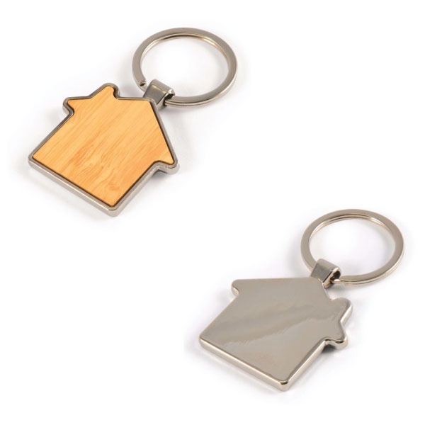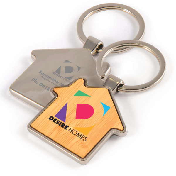 This bamboo & zinc keyring is perfect for real estate agents & house construction companies. The house shaped key ring is made from nickel plated cast zinc with a natural eco friendly bamboo insert. Priced here for a full colour print on the bamboo side, so you can really let your branding shine! There is also an option to engrave the metal side of the key ring, ask our friendly staff about pricing for this