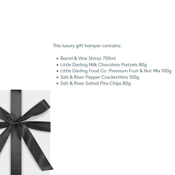 Delight and excite everyone with this luxury Lyndon Alcohol Hamper! The gift hamper contains quality products such as Shiraz, pita chips, chocolate pretzels and more! It is all presented beautifully in a glossy gift box with tissue paper and satin hand-bowed ribbon. The hamper comes with branded gift cards. This is a perfect gift option for Christmas, for valued clients and any other occasion!