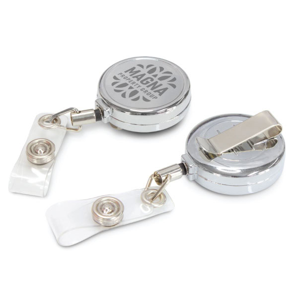 The Metal Zip Pull Badge Holder is a retractable stainless steel ID holder with a reliable steel spring. It has a pocket clip on the back and a plastic ID card holder dome attachment.