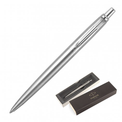 Whether pad printed or engraved (silver finish), the Parker Jotter Metal Ballpoint Pen is a classic. Your client's promotional logo can be placed on cap or upper barrel by either method and the blue ink is provided by a push action, retractable ballpoint.