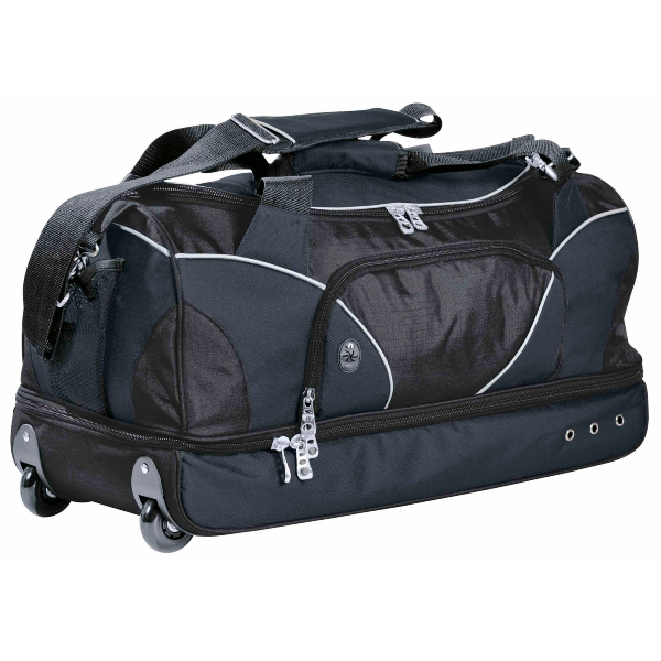 This is a perfect travel companion! It has a huge 62 Litre capacity and comes with a large main zippered compartment and also a drop bottom compartment with baseboard and ventilation eyelets, which is perfect for storing shoes, clothes that need laundering and damp swim suits etc. The bag comes with in-line skate style wheels to make moving the bag a breeze! There is also a zippered side accessory pocket with a rubber headphone exit port, a mesh drink bottle pocket, for hydration on the go! The bag features heavy duty oversized zippers & accessories, reflective piping and reinforced large webbing handles with a padded Velcro closure and a padded end quick-grab handle. Comes in black/charcoal
