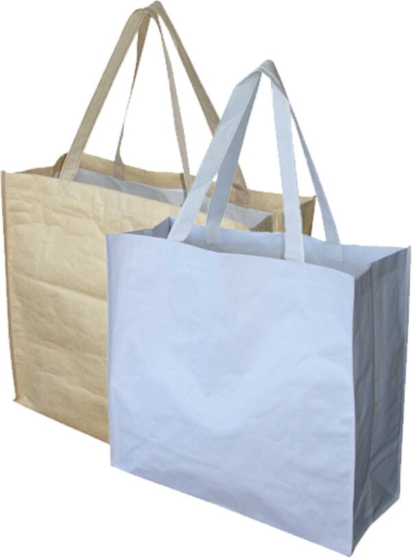 Our Tuff Tote Mega Shopper Bag is our largest paper style bag with white PP woven, lined interior. They feature non woven handles with piping and are capable of carrying heavy loads. They are also water resistant, tough and durable making them a great choice for many uses. An excellent, budget option for an eco friendly campaign or event.