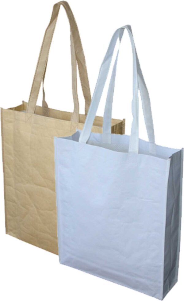 Our Tuff Tote Plaza Paper Bag is perfect as a reusable shopping bag with white PP woven, lined interior. They feature non woven handles with piping and are capable of carrying heavier items. They are also water resistant, tough and durable making them a great choice for many uses. An excellent, budget option for an eco friendly campaign or event.