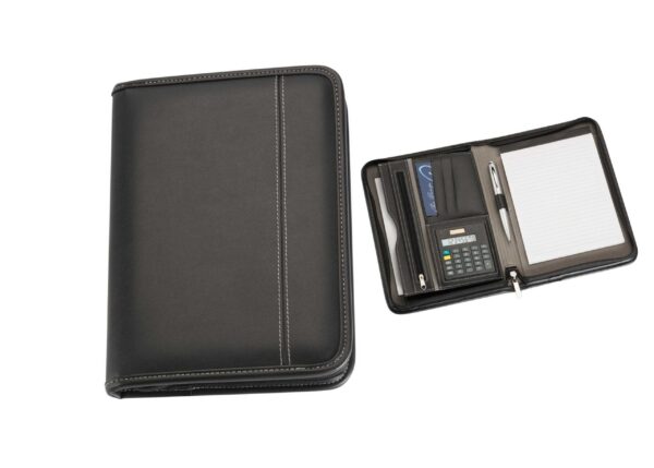 The Wyndham A5 Zippered Compendium is an A5 sized zippered compendium in koskin leather-look material with white contrast stitching and taupe coloured EVA material contrast panels inside. Includes 25 page lined pad which insert from the top, solar calculator, internal pocket and zippered internal pocket, business card holders and pen loop. Pen not included. See image for product colour.